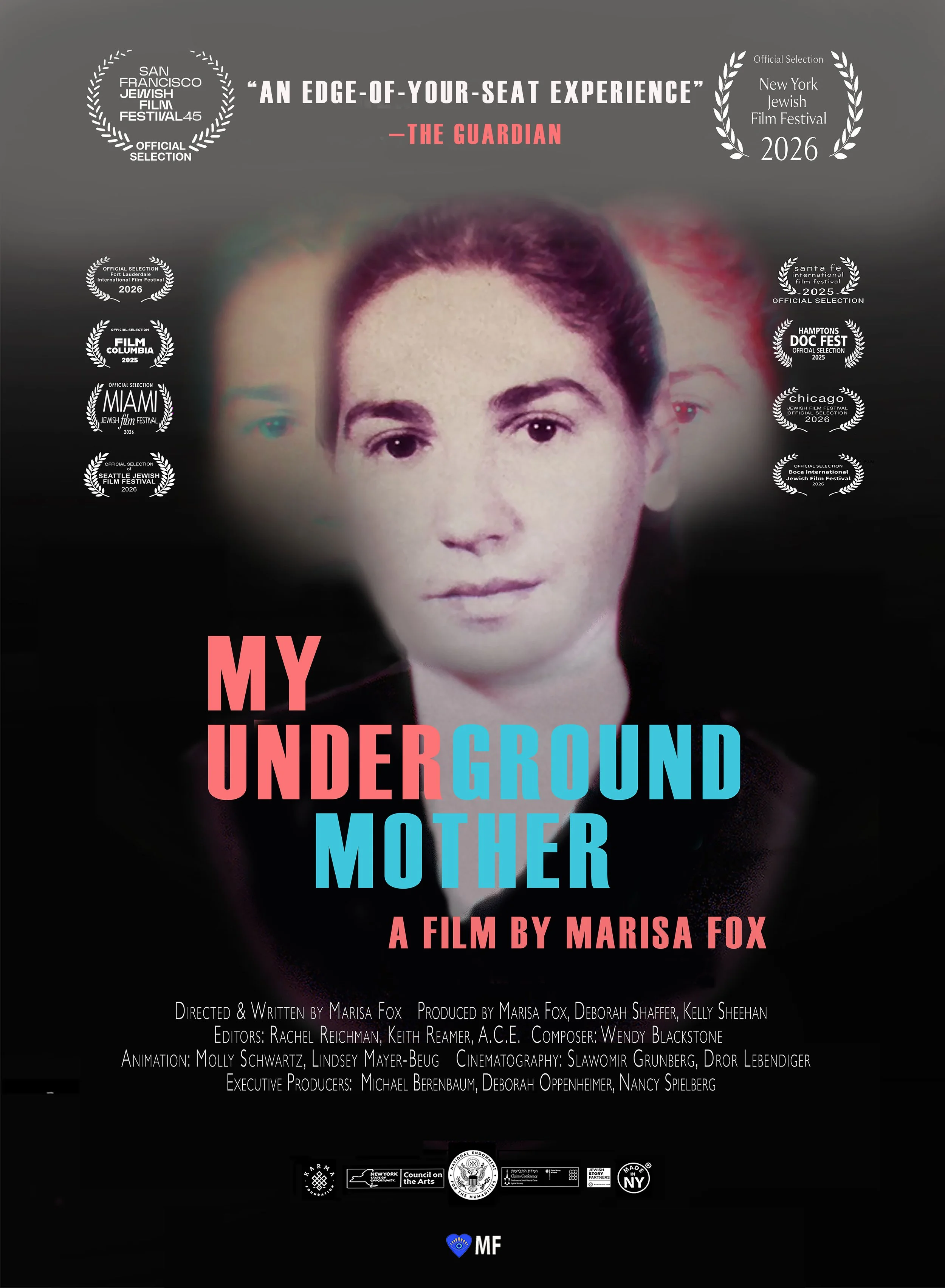 MY UNDERGROUND MOTHER is a gripping documentary feature that explores the daring sisterhood and hidden traumas of survivors of Jewish women’s camps during the Holocaust through a daughter’s unraveling of the stories her mother told. The film has been made with assistance from The National Endowment for the Humanities, the Conference on Jewish Material Claims Against Germany supported by the German Federal Ministry of Finance, Jewish Story Partners, the New York State Council on the Arts, the NYC Women’s Fund for Media, Music and Theatre, presented by the City of New York Mayor’s Office of Media and Entertainment, in Association with the New York Foundation for the Arts, the Jewish Film Institute and many private foundations. The film’s fiscal sponsor is the Center for Independent Documentary (CID)